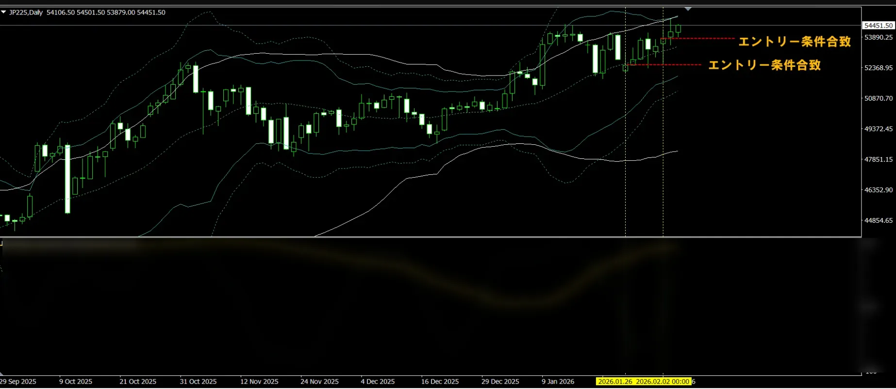 日足チャートを振り返ると、そこには誰が見ても「同じ場所」だと断言できるエントリーポイントが2回出現しています。