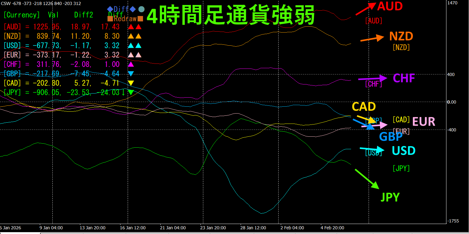 4時間足では、AUD、NZD、USD、EUR、CHFが上向きに、JPY、CAD、GBPが下向きになっています。