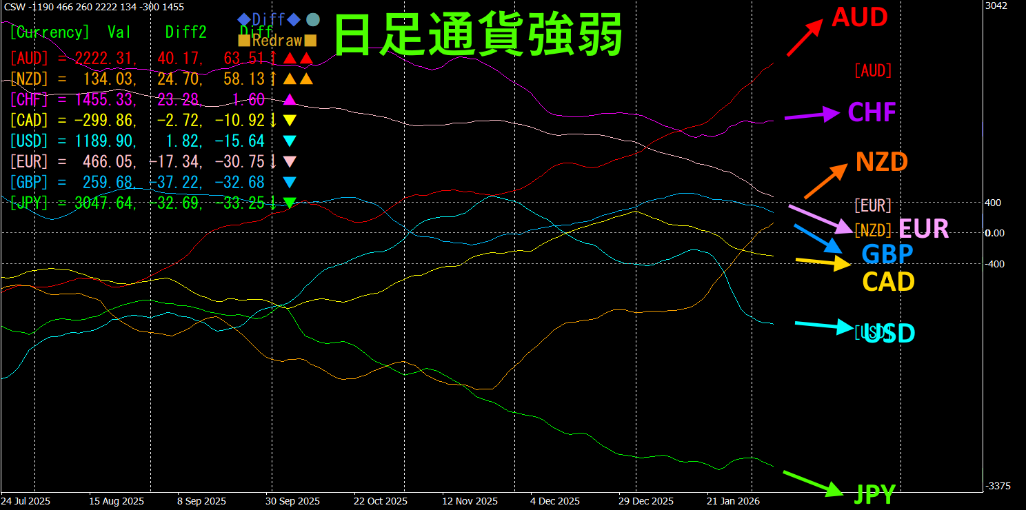 AUD、NZD、CHFが上向きです。JPY、GBP、EUR、USD、CADが下向きになっています。日足では、JPYの下落と、AUDの大きな上昇が目立っています。