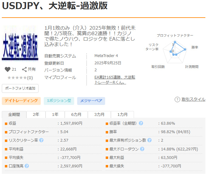 ★★ライブ配信必見★★1月1敗のみ(介入)2025年無敗!!2月無敗☆☆2/10前代未聞!84戦全勝&75勝&27連勝のEAあります!そして世界初!?次世代手法ライブ配信でEAの方向教えます。