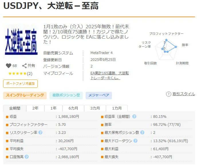 勝率は、購入時期、相場状況、EAのセット時期により変動します。EAをセットする場合は大幅に上げ/下げの後にセットして下さい。
