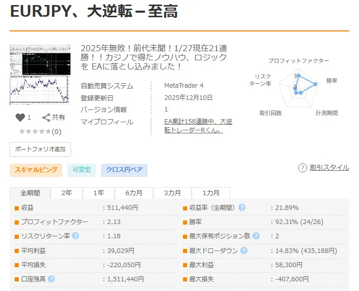 1月1敗のみ(介入)2月無敗!優秀な売上ランキング1位のEA!