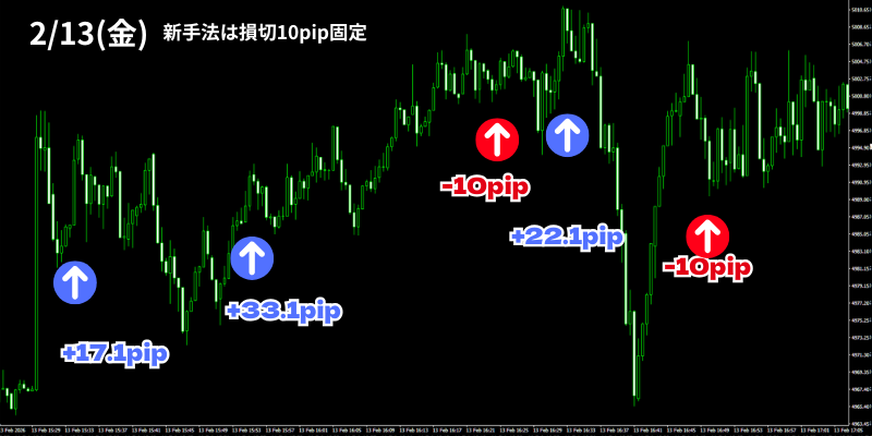 2月13日の「30秒足GOLDオートマチックFX」のトレード結果