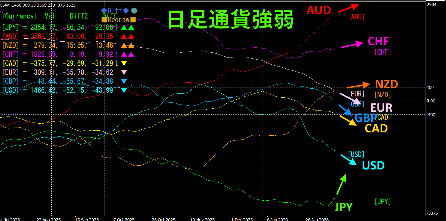 JPY、AUD、NZD、CHFが上向きです。USD、GBP、EUR、CADが下向きになっています。日足では、JPYの著しい上昇と、USDの下落が目立っています。