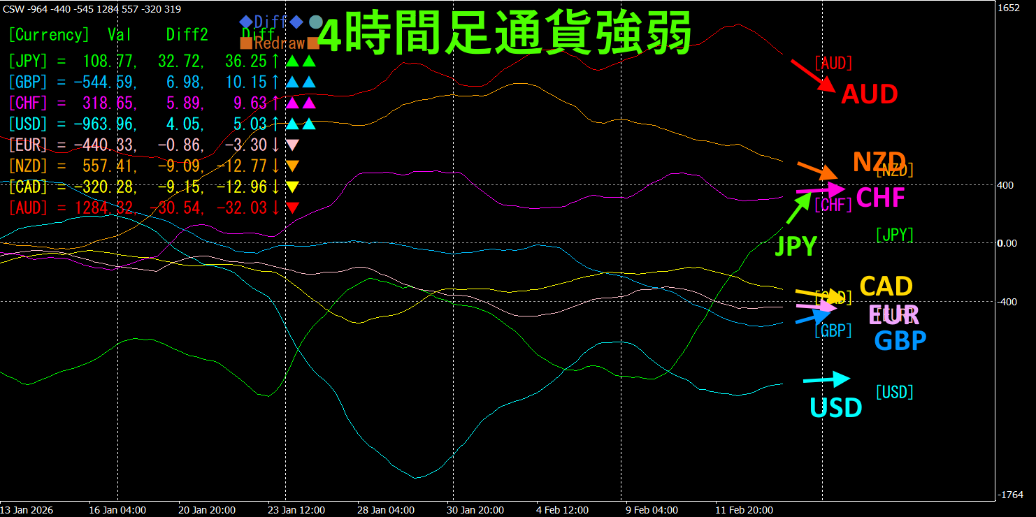 4時間足では、JPY、GBP、CHF、USDが上向きに、AUD、CAD、NZD、EURが下向きになっています。