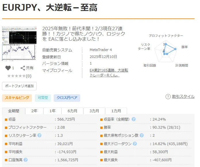 ★★ライブ配信必見★★1月1敗のみ(介入)2025年無敗!!2月無敗☆☆2/13前代未聞!100戦全勝&77勝&28連勝のEAあります!そして世界初!?次世代手法ライブ配信でEAの方向教えます。