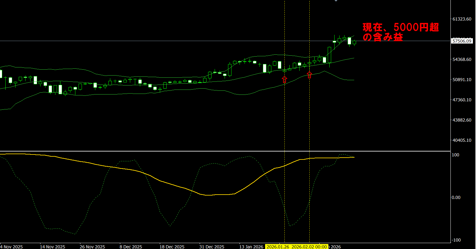 その後の相場は小さい押し目を経て急上昇しており、現在、大幅な含み益が乗ったポジションになっています。
