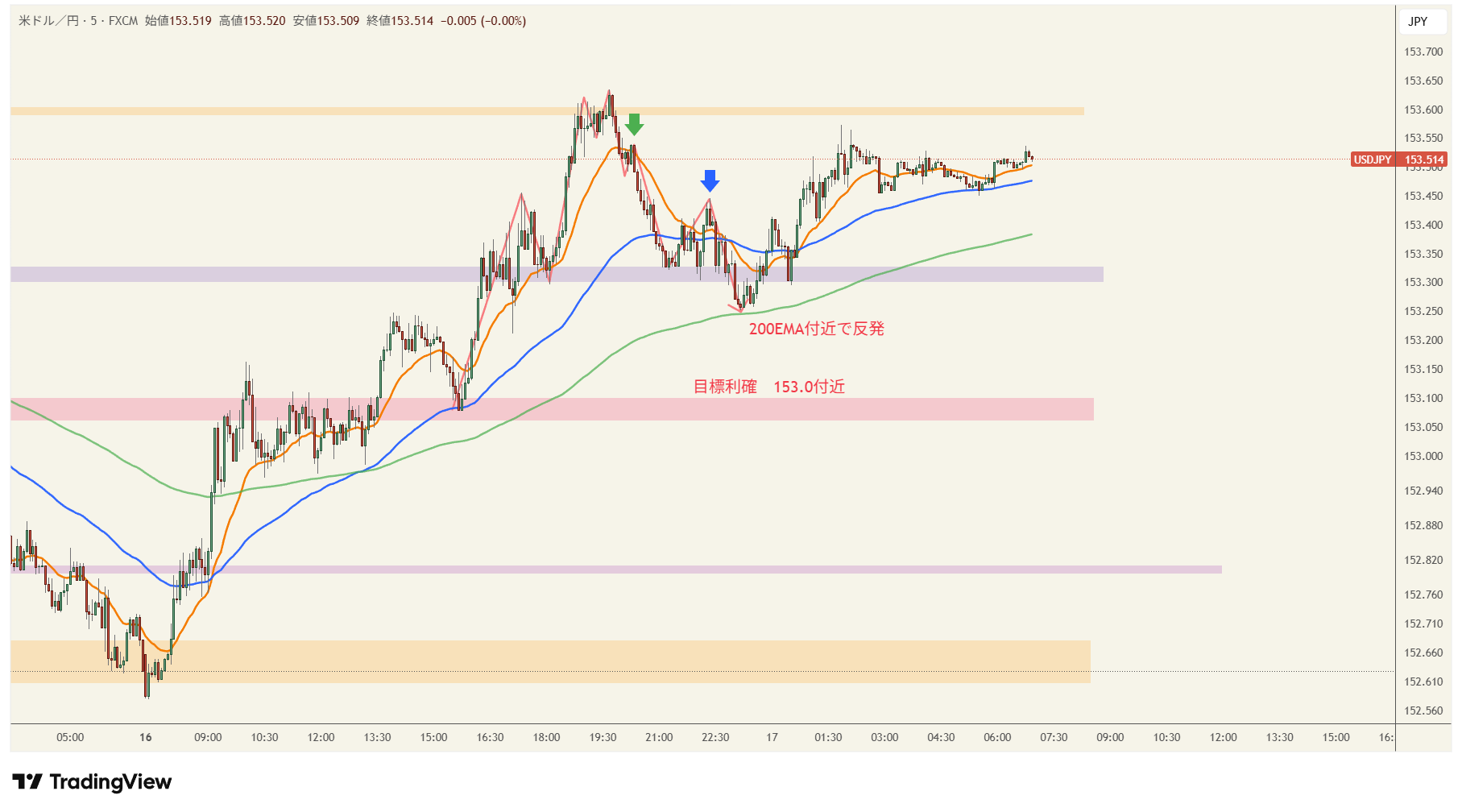 その後、シナリオ通りに動きましたが、目標とする利確位置まで伸びず、200EMAで反発しました。