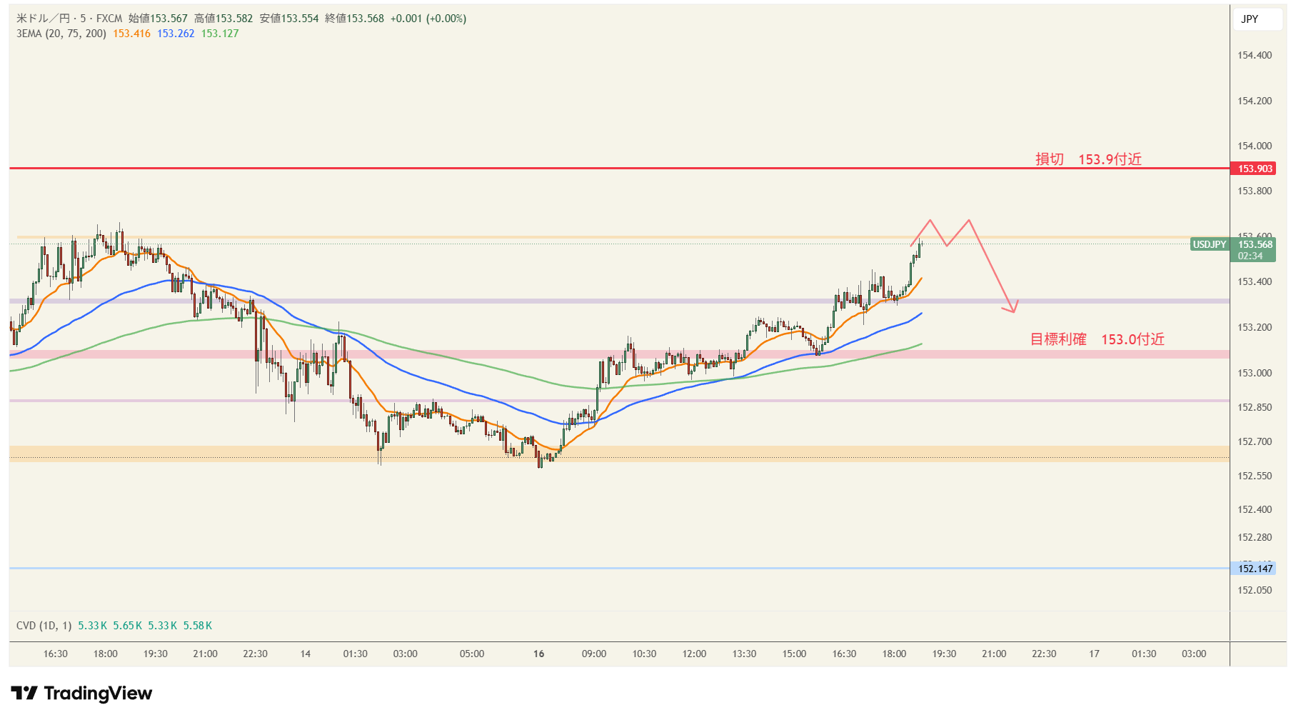 〇基本方針: ① 5分足でレンジ上限付近到達 ② Wトップなどのチャートパターンが出現してからの売り検討(ネックライン戻しからのエントリー)