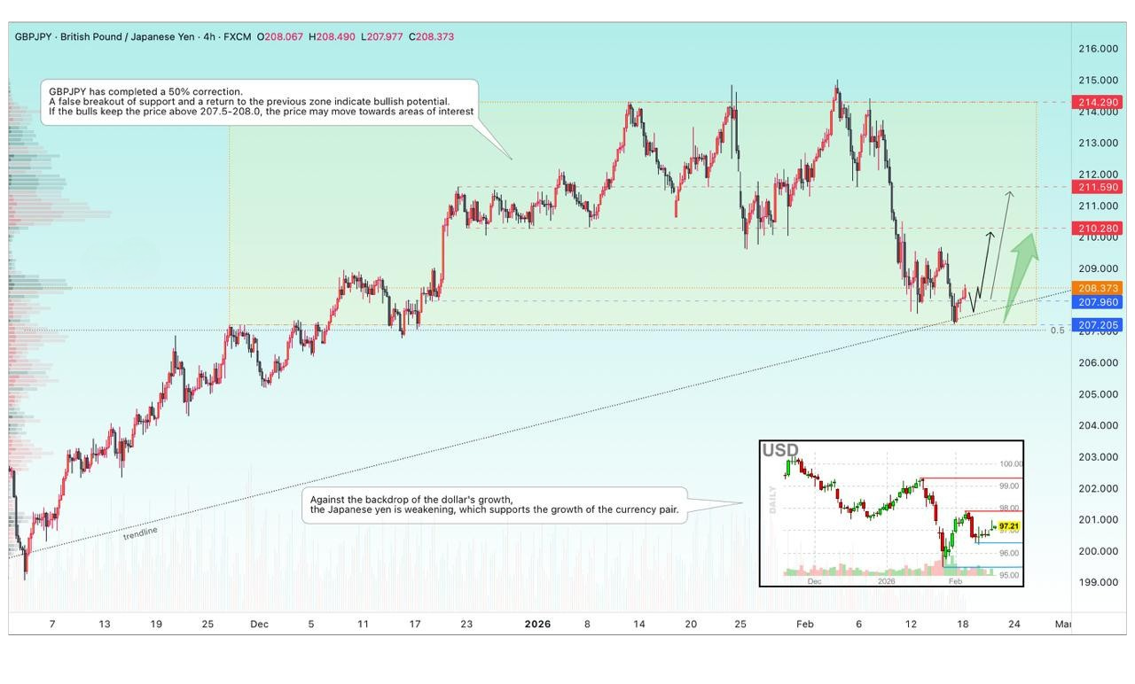 GBPJPYは50%の調整を完了しました。サポートの偽ブレイクと長期ゾーンへの回帰は強気の可能性を示します。ブル勢力が207.5 - 208.0を上回って価格を維持すれば、価格は関心エリアへ向かう可能性があります。
