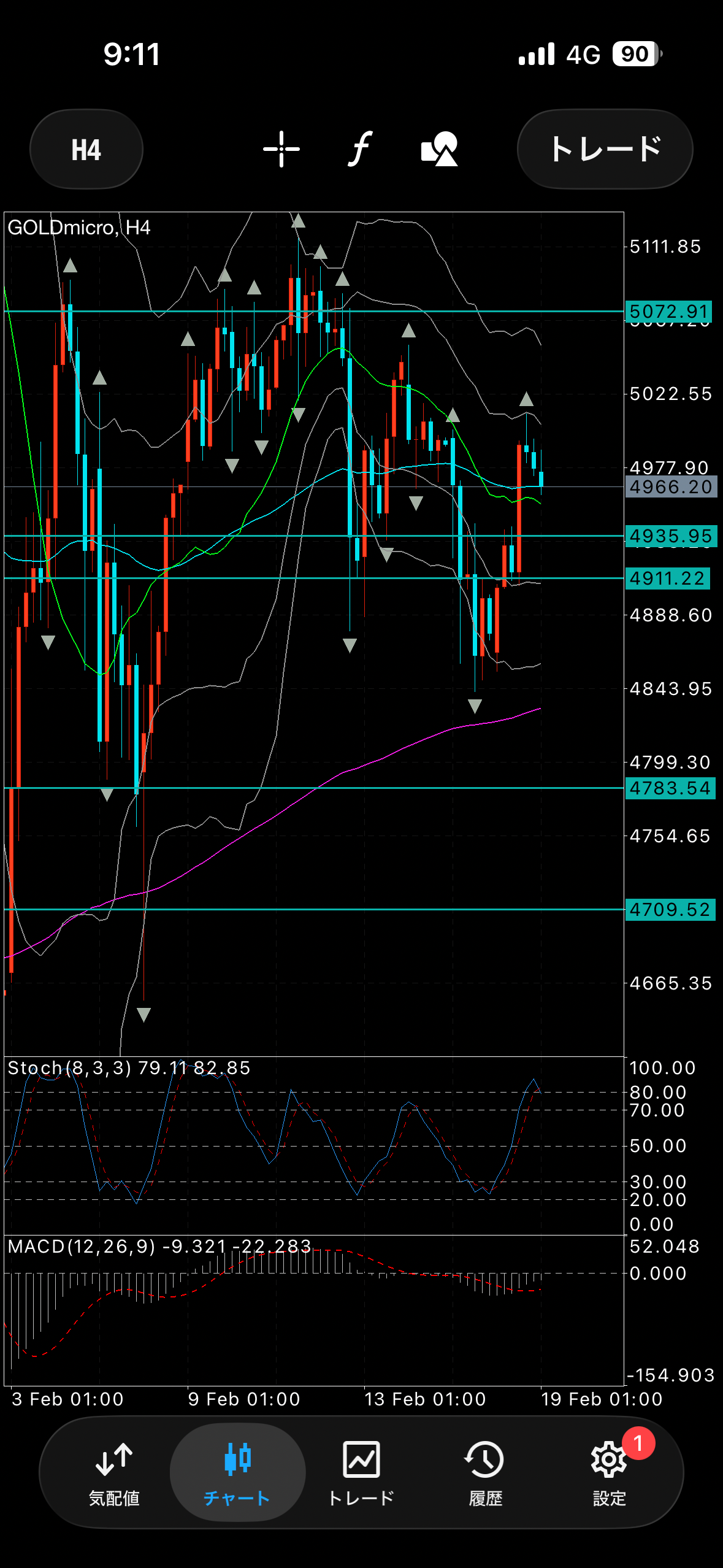4時間足もレンジです。