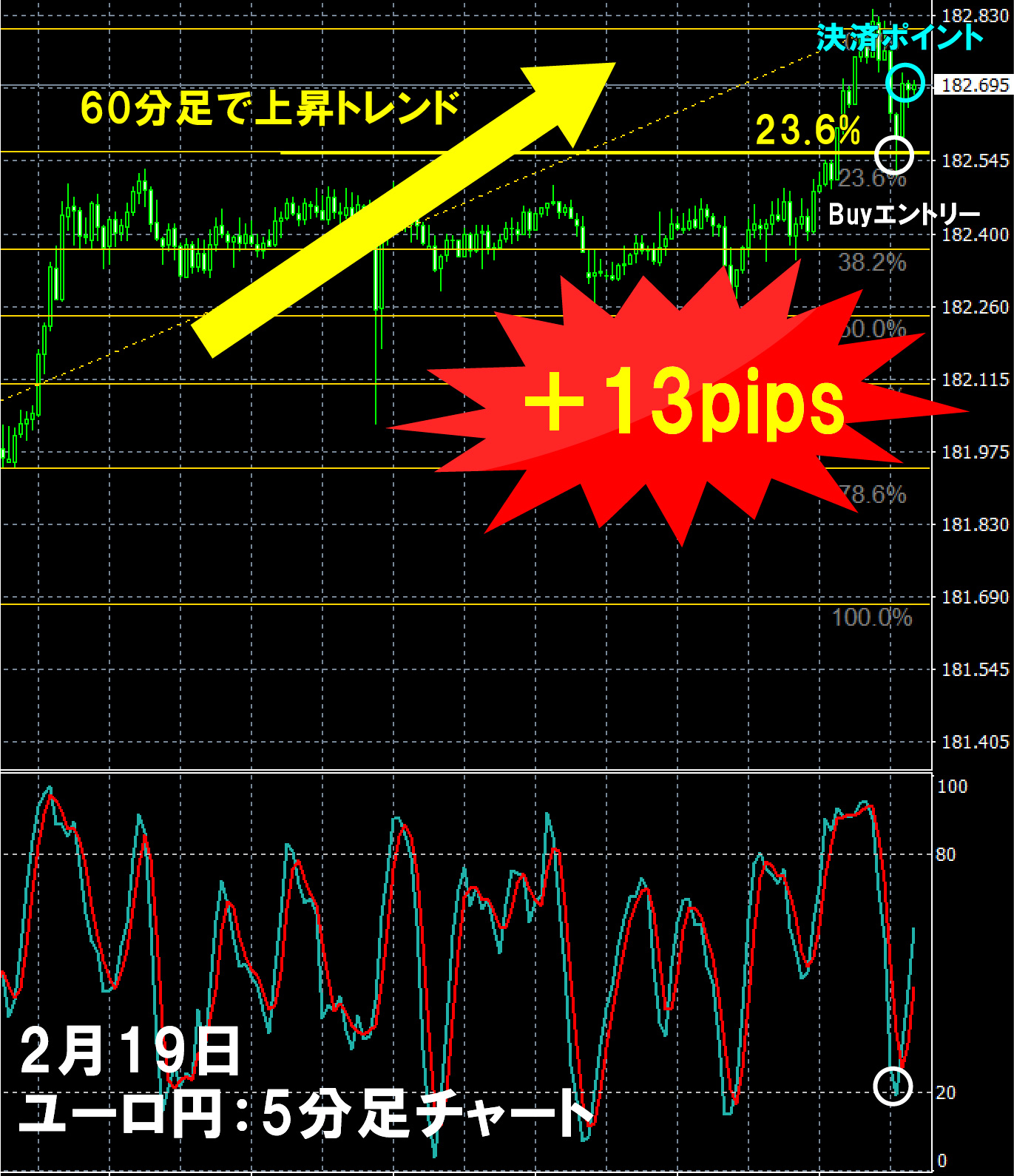 ②その後、5分足で23.6%まで押し目形成。