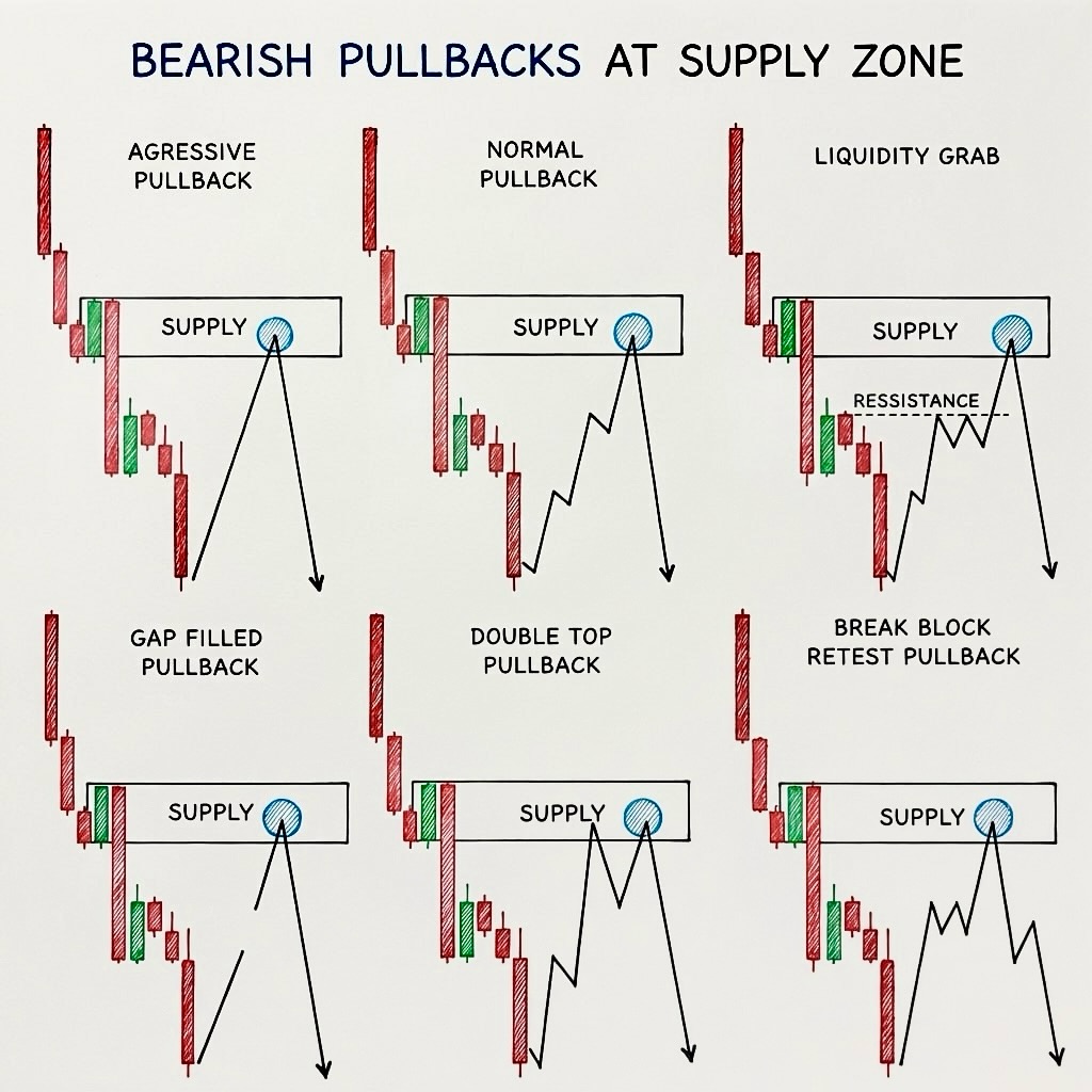 6つのセッティングは共通のアイデアを共有しています:売り手が強い供給ゾーンから価格が下落し、それから供給ゾーン(売り手が強い場所)、次に反発して上昇し、そのゾーンを再度テストしてから下落を続ける。違いは反発の形がどうなるかです。