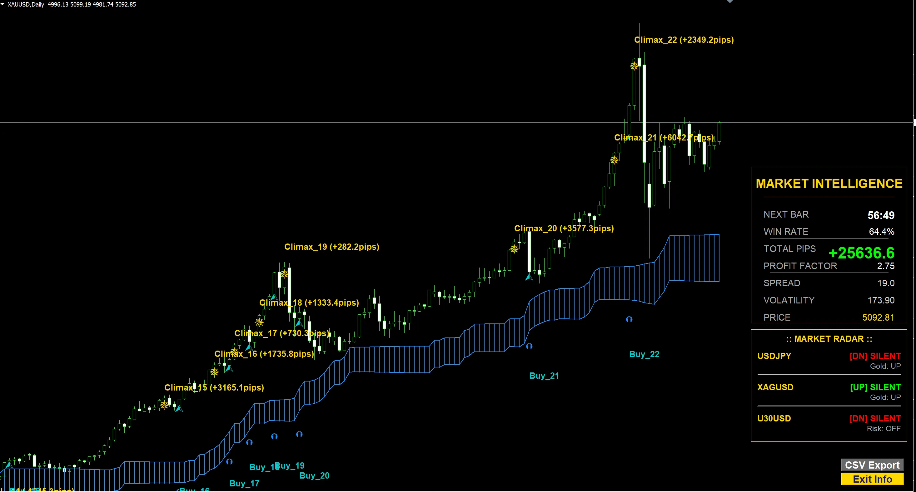 高度なエグジット戦略: 単なる利確・損切りではなく、追随型のトレーリングストップやオシレーターによるクライマックス決済を搭載!