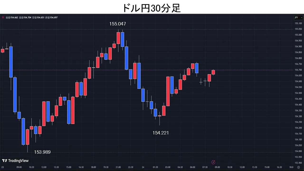 東京時間、ドル円は、日本市場が祝日の中、2/20に米連邦最高裁が「トランプ大統領による広範な関税措置」を違法とする判断を下した事によるドル売りの流れを引き継ぎ、153.98円まで下落。欧州時間、ドル円は買戻しが先行し155.04円まで上昇。NY時間、米関税政策を巡る不確実性を背景に米国株が軟調に推移し、米10年債利回りが低下したことなどを受け、ドル円は154.22円まで下落。