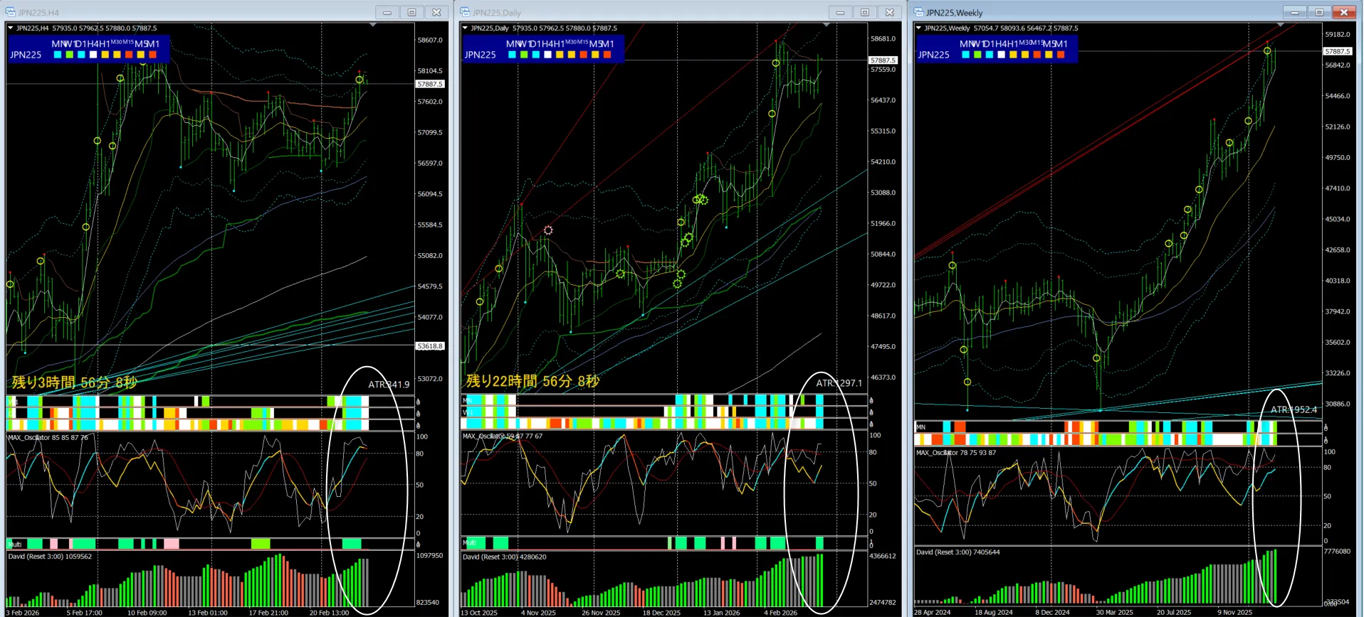 一方で、週足のMAXオシレーター、シンクロバンドは「強い上昇」を示唆