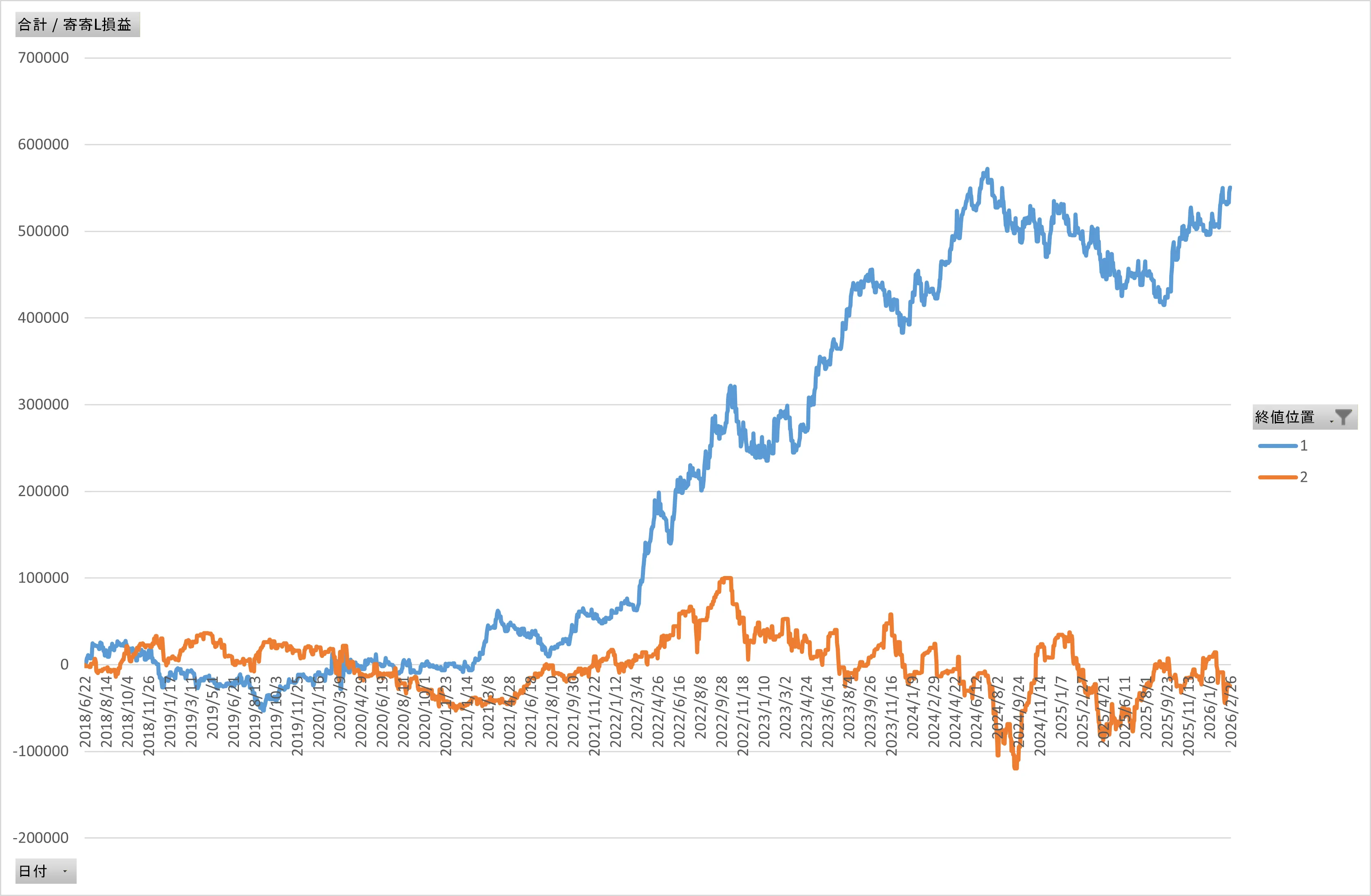 前日高安の50%以上で引けた場合(青)と以下(オレンジ)で利益曲線に圧倒的な差が。