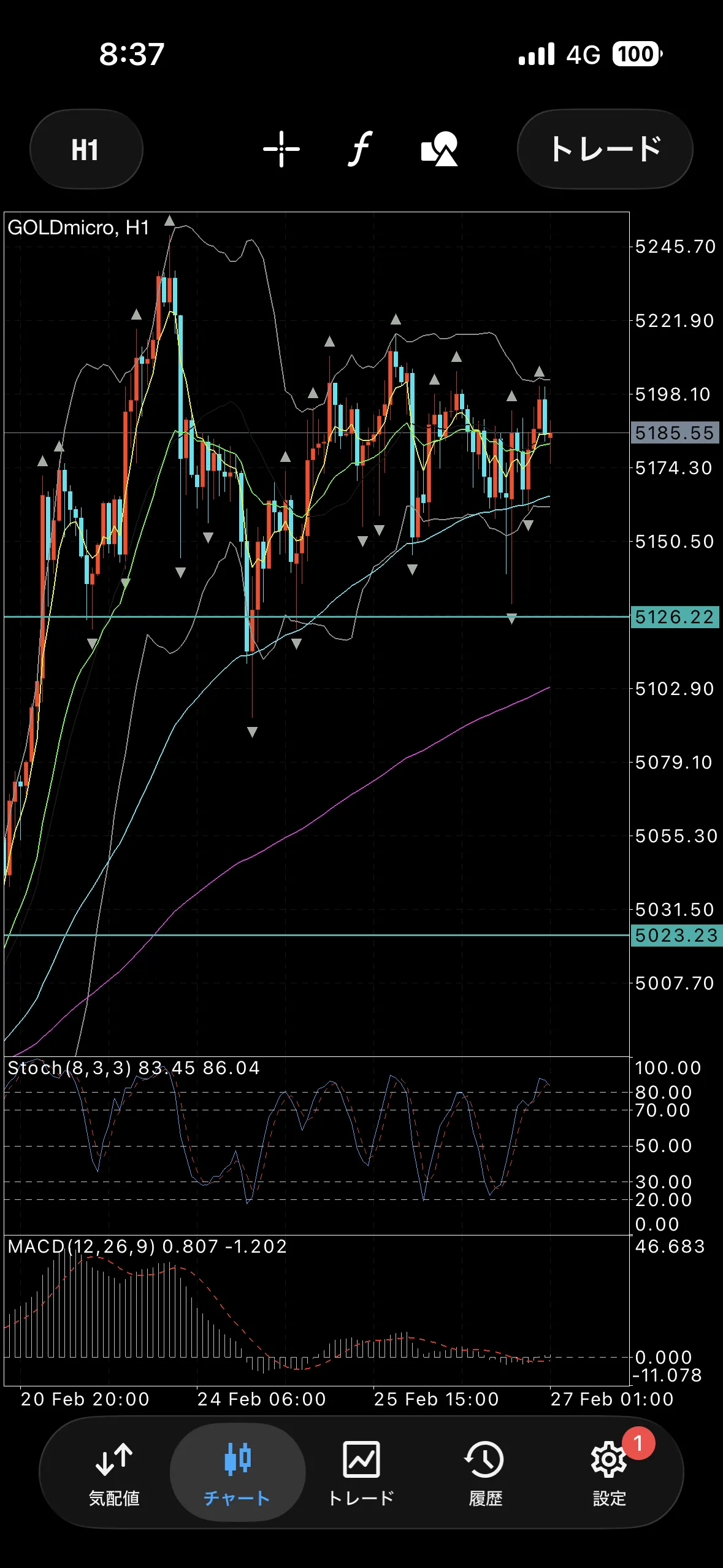1時間足は三角作って来てますが、75MAに規則性が出ていためここを下抜けると損切りを巻き込んで下がっていく可能性が高いです。