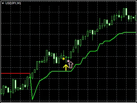上のチャートでは、スーパートレンドのレジスタンスラインを上抜けした後の押しで【STRCI】の買いサインがタイミングよく点灯しています。