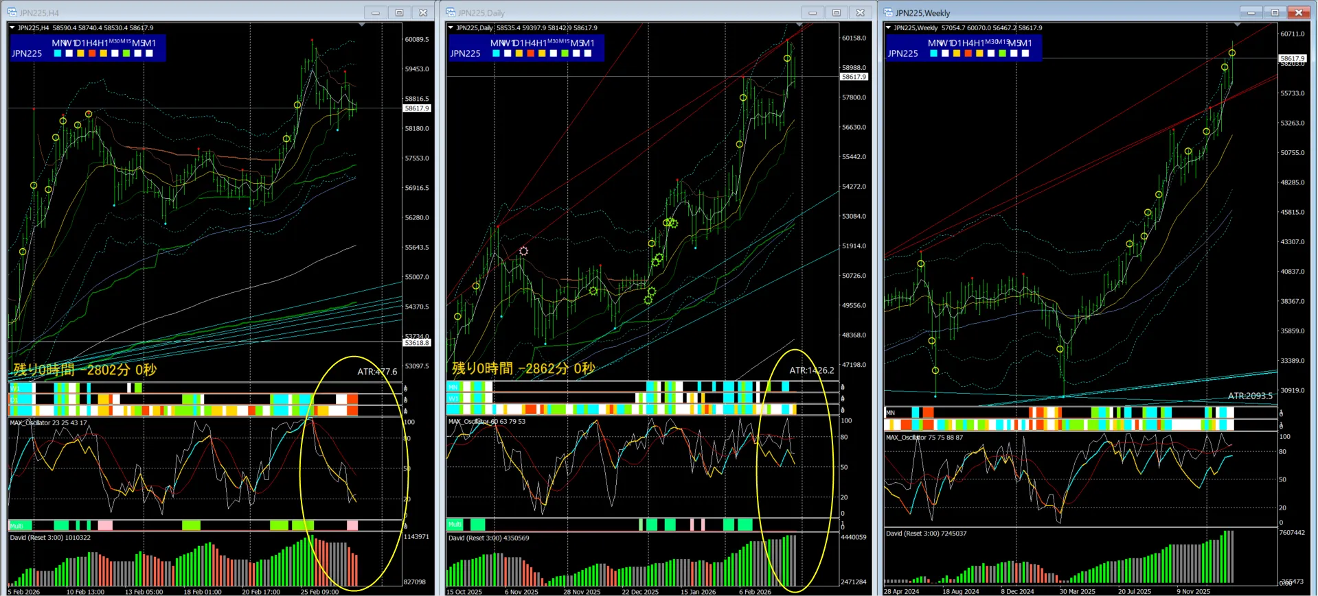 一方で、週足のMAXオシレーター、シンクロバンドは「中立」を示唆