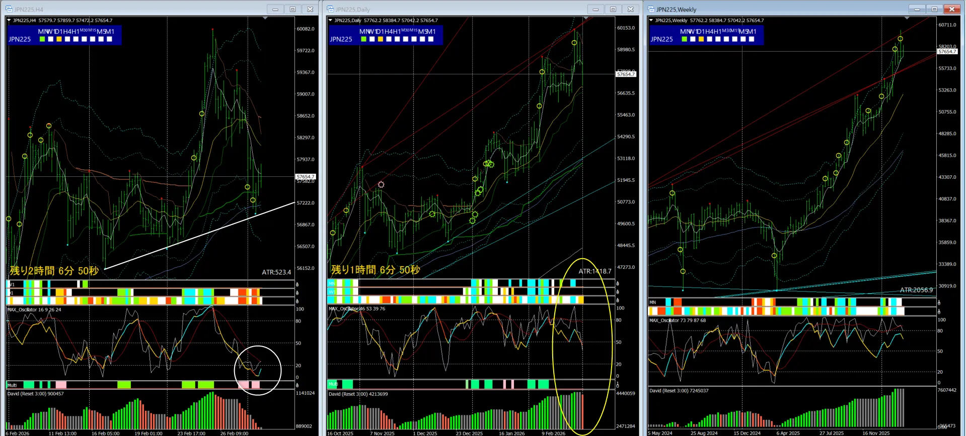 一方で、週足のMAXオシレーター、シンクロバンドは「中立」を示唆