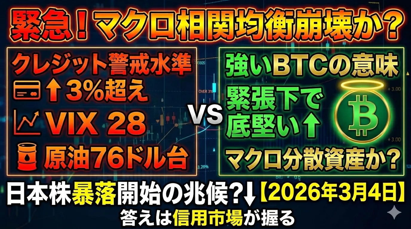 本日のマクロ相関【2026年3月4日】― クレジット警戒水準入り、VIX28、原油76ドル台。緊張下で強いBTCの意味 ―