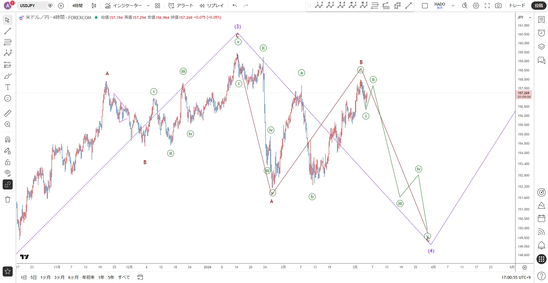 【ドル円】4時間足の分岐ポイント / 3月5日(木)のイベントエリオット波動分析