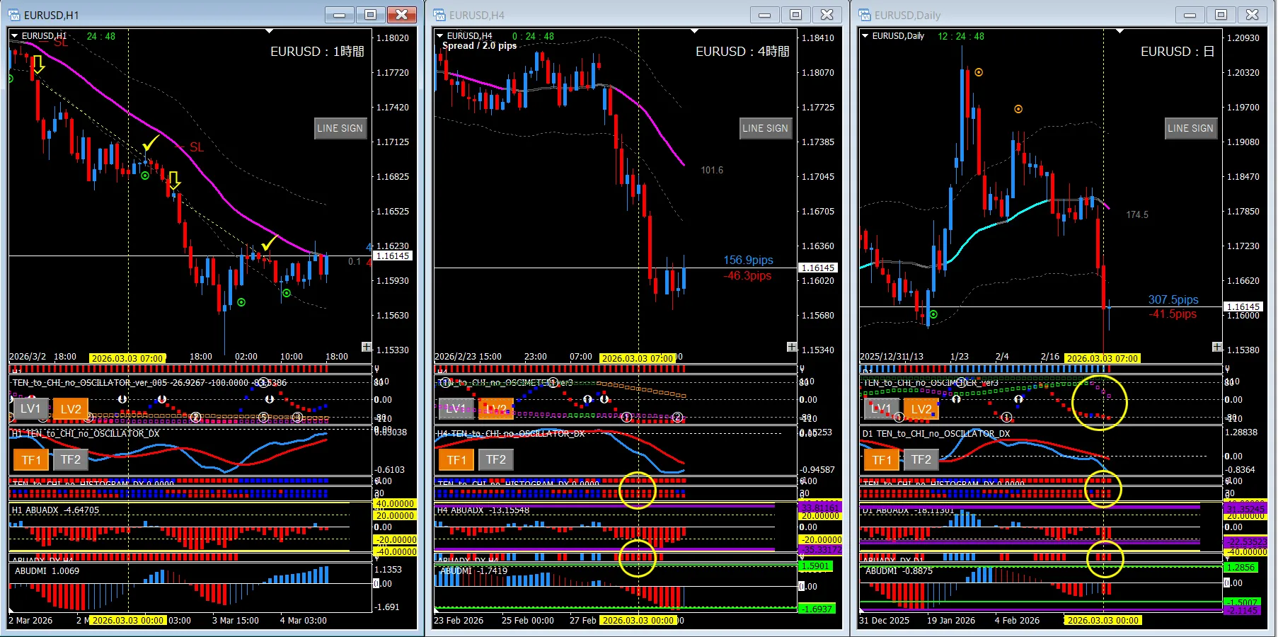 前回の記事で書いた環境認識の勢いがまだ続いています。やはり日足と4時間足のABUADX_DXが重なると強いですね。日足のABUADX_DXが消灯するまで待つ、もしくは安全策でオシレーターTF1の色転換で下目線リセットと考えると良いでしょう。