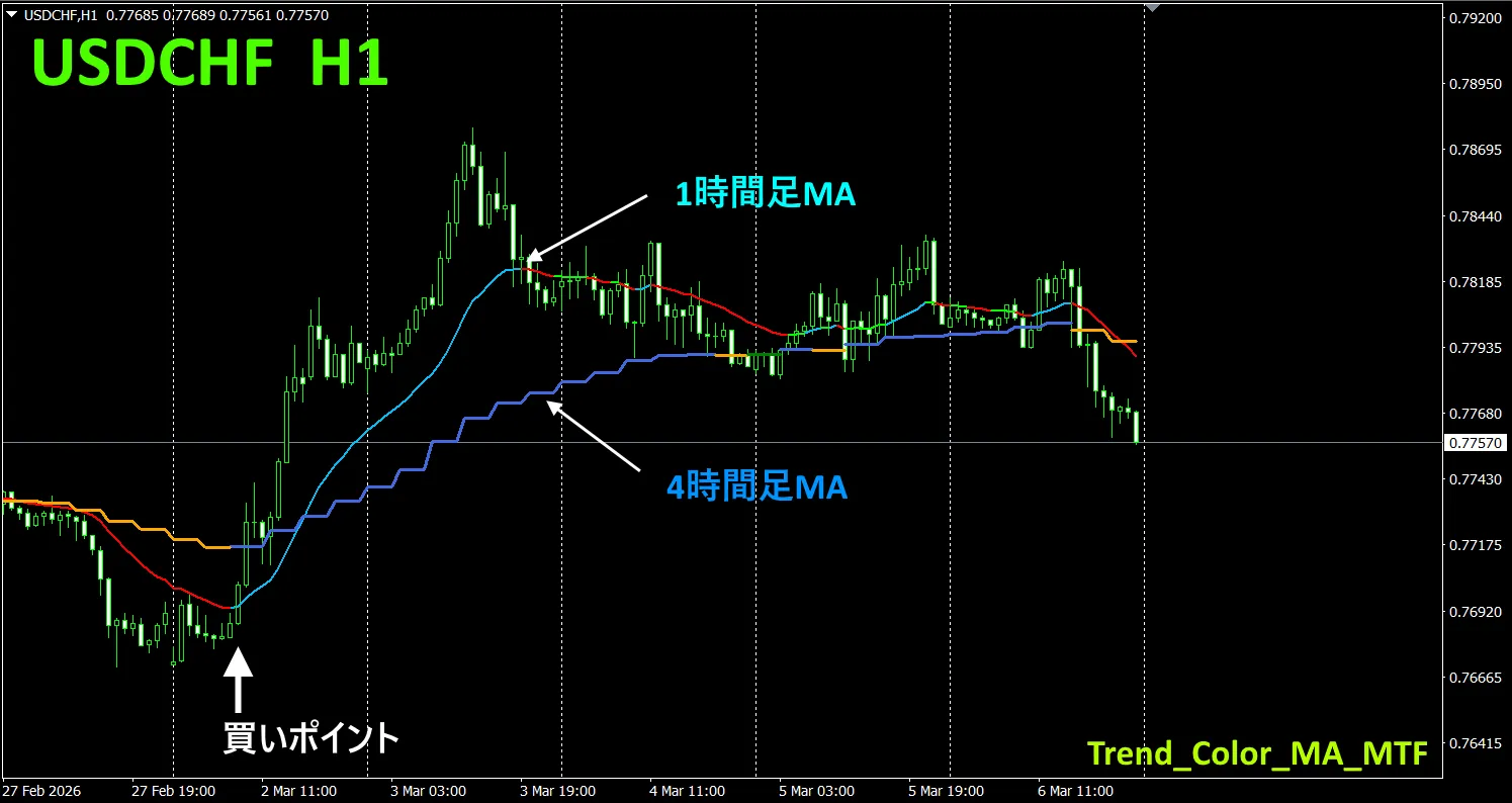 一例として、UFDCHFの1時間足チャートに、4時間足の移動平均線を同時に表示させてみました。ガタガタと階段状になっているのが、4時間足の移動平均線です。1時間足の移動平均線も、4時間足の移動平均線も、上昇時は青色系のカラーで、下降時は赤色系のカラーで表示されるので、カレントチャートのトレンド方向と、上位足のトレンド方向が、カラーで一目で判別できます。