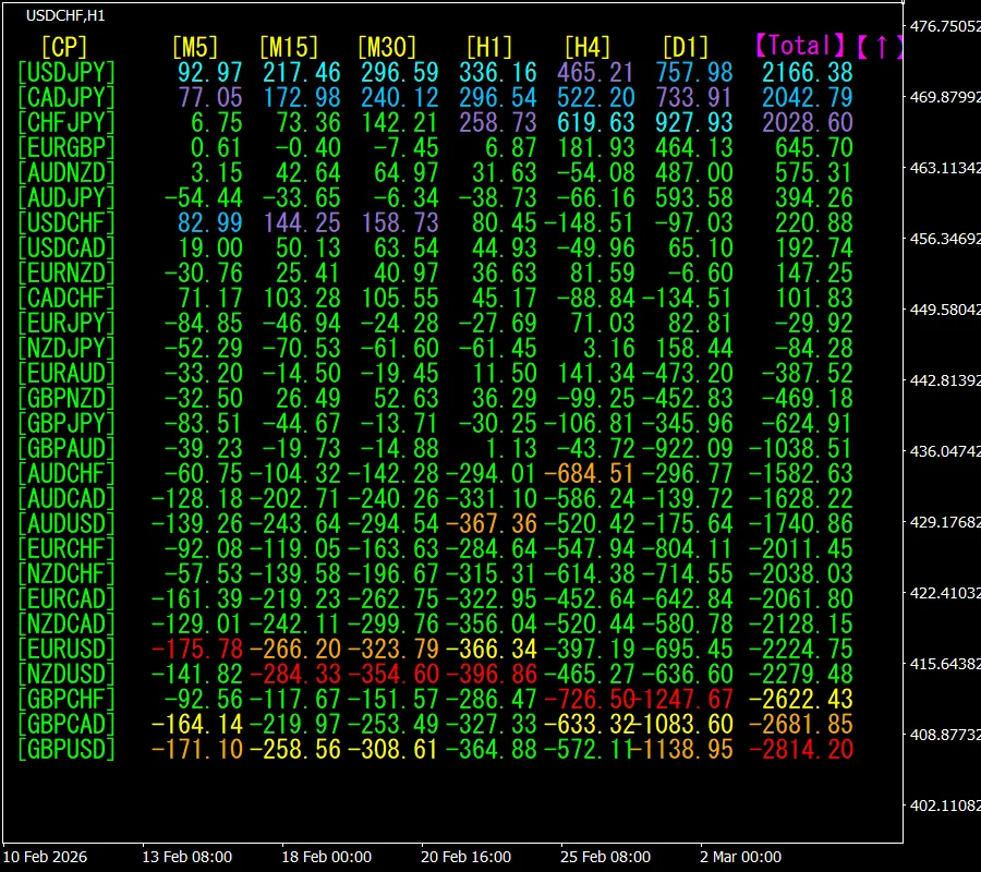 [Total]数値の降順に並んでいます。一番上にあるUSDJPYは、全ての時間足で青色系の表示色になっています。Total数値が、2166.38で、プラスの数字になっています。USDJPYに上昇トレンドが発生していることが示唆されます。