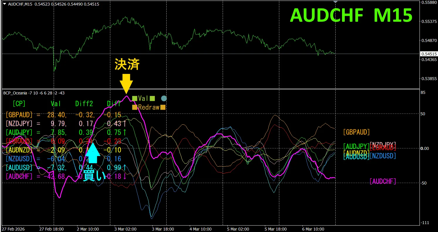 上半分は、AUDCHFの15分足チャートです。下半分は、「8CP見える化インジケータ」によるものです、赤紫色のグラフがAUDCHFに相当します