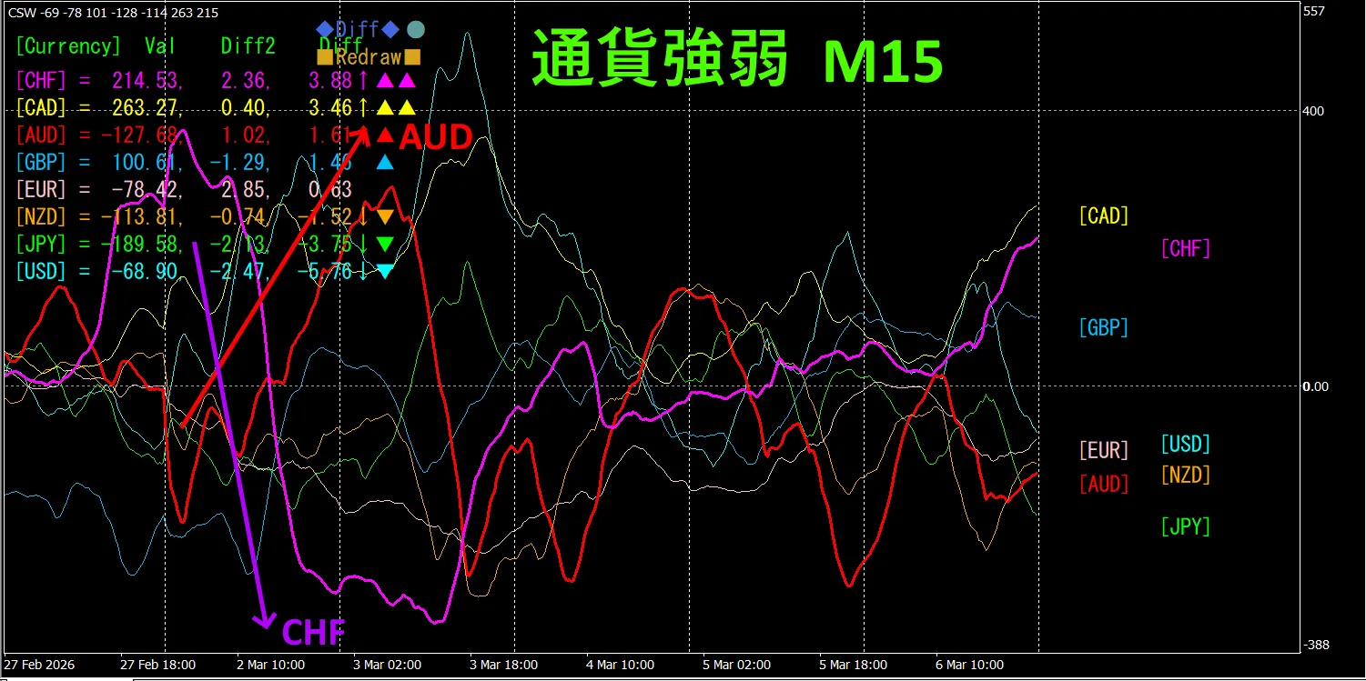 15分足の通貨強弱グラフを見ると、AUDが強く、CHFが弱くなっていて、通貨強弱グラフで、AUDとCHFが、逆相関関係になっていることがわかります。