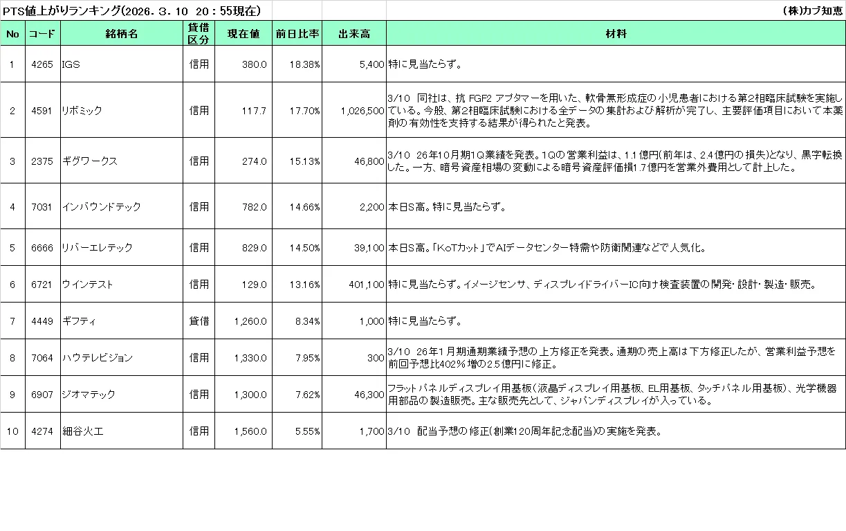 カブ知恵発 PTS値上がりTOP10(2026/03/10)