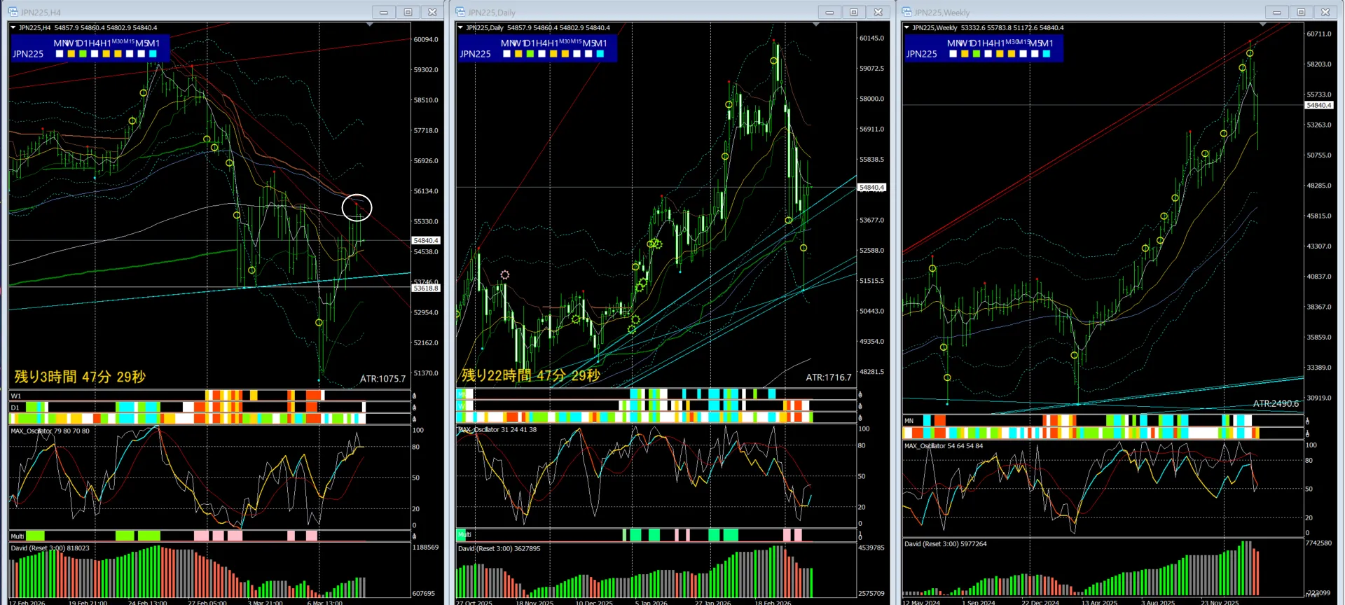 一方で、週足のMAXオシレーター、シンクロバンドは「弱い下落」を示唆