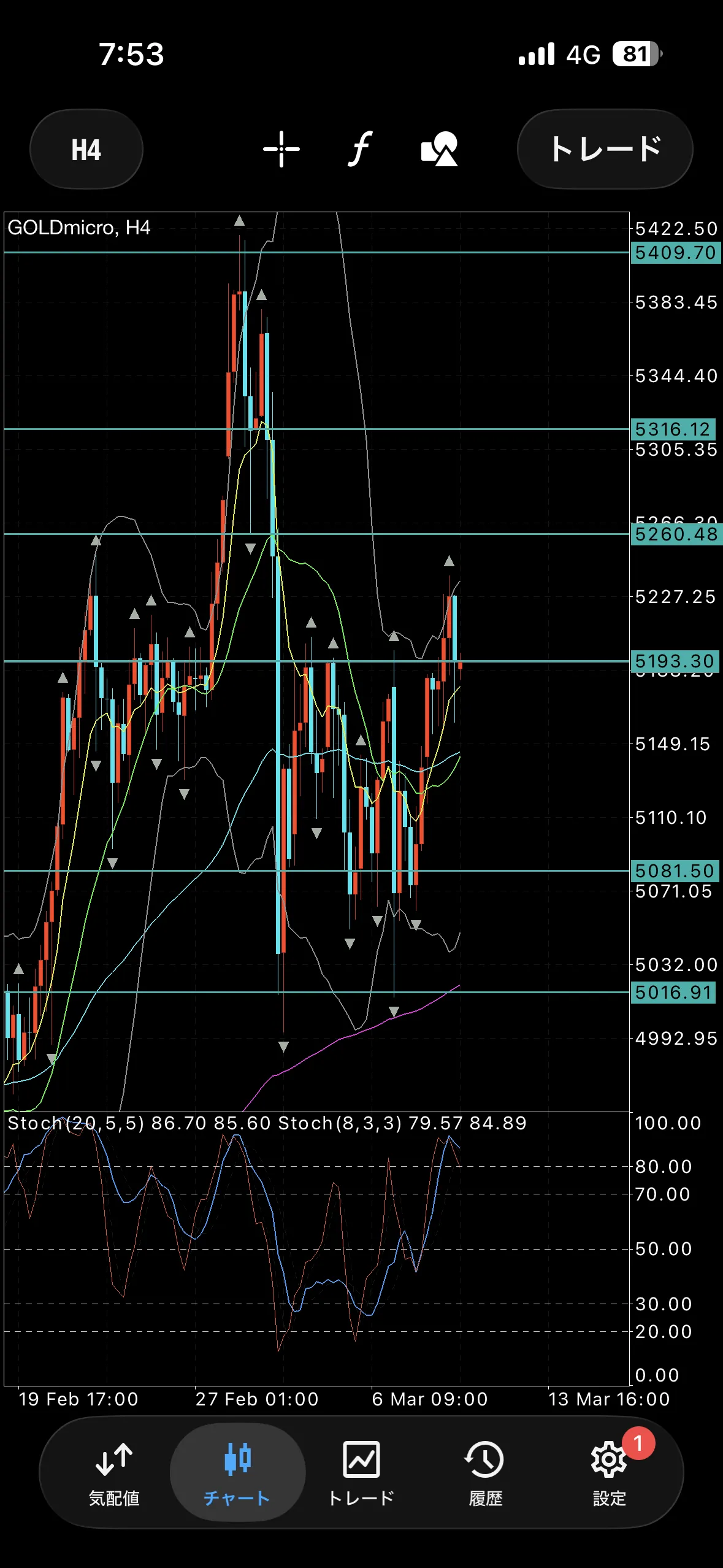レンジ抜けしているため5193付近の水平線を下回るまでは上目線、下回ったら再度レンジ入りという形になります。