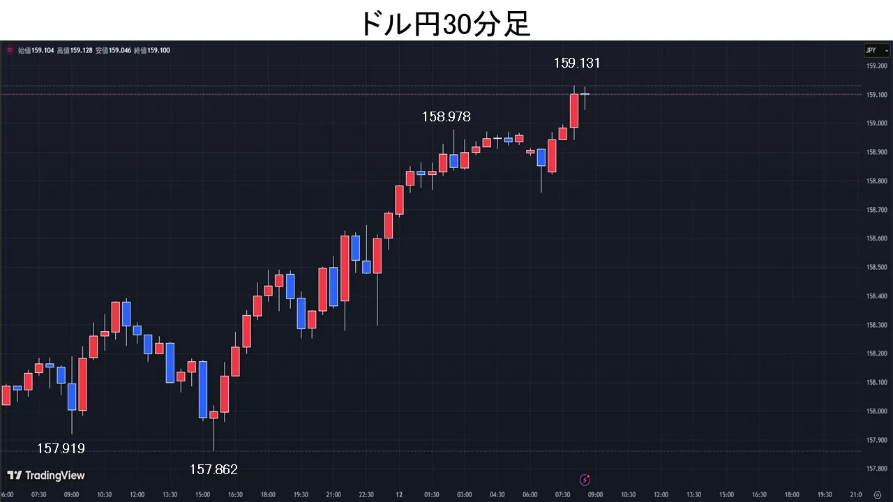 中東情勢緊迫化、有事のドル買い継続で、ドル円は159円台。