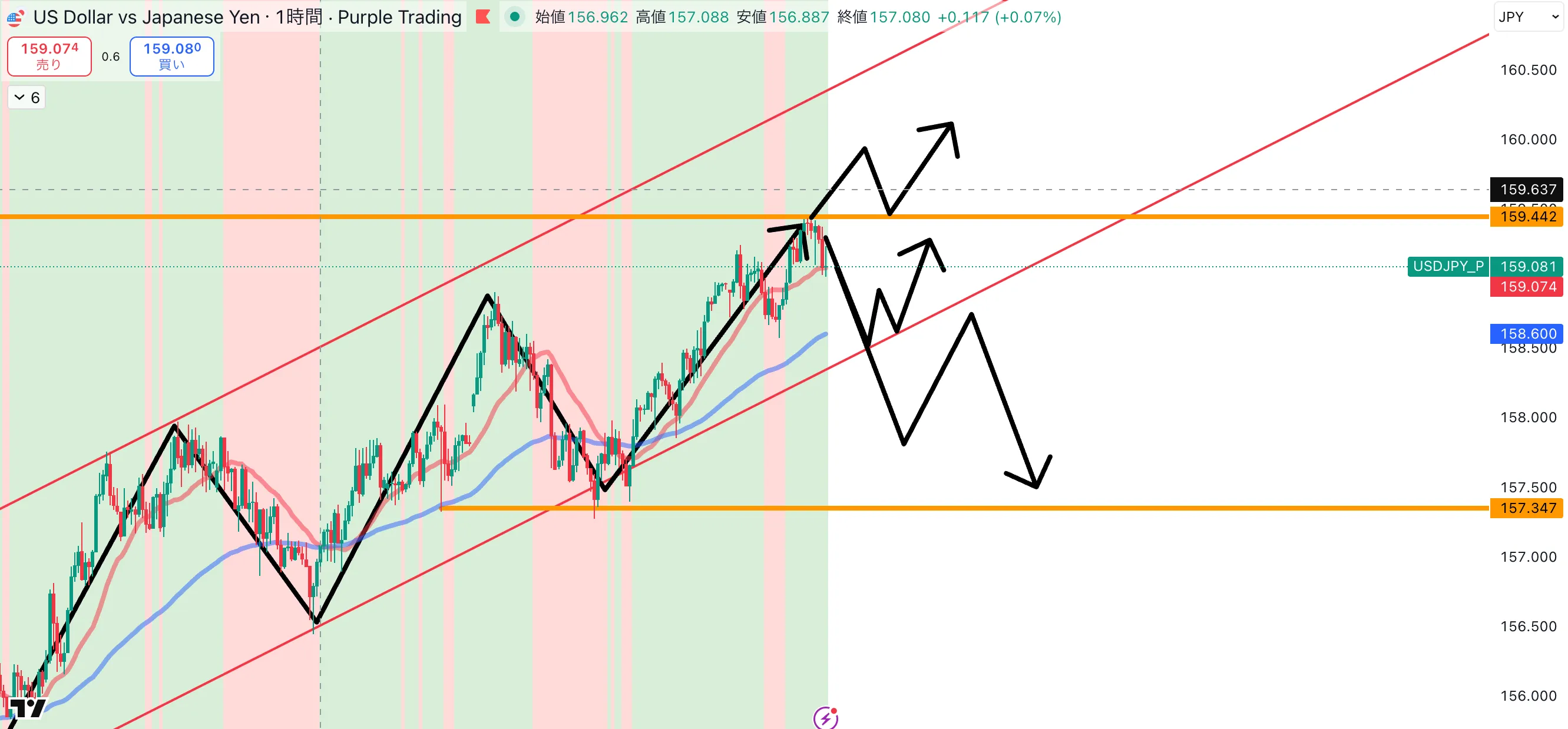 現在のドル円は、1時間足で見ると 上昇チャネルの中をきれいに推移している状況です。 昨日の分析でもお伝えしましたが、ドル円は 159円ミドル付近(前回高値)まで上昇してきました。 ただ現在は、その前回高値付近で 上値を抑えられている状態です。 このため、今日の注目ポイントは次の2つになります。 ・159円ミドルを上抜けするのか ・反発してチャネル下限まで押し戻されるのか この動きによって、次のトレードシナリオが見えてきます。 基本戦略は押し目買い 現在の相場は 上昇トレンドが継続中のため、基本的には 買い目線で見ています。 ただし、159円をブレイクした瞬間に飛び乗るのではなく、 ブレイク → 押し目 → 上昇 この形を待ってからエントリーするのが基本戦略です。 例えば ・159円をブレイク ・再度159円付近まで押す ・サポートとして機能 このような動きになれば 押し目買いのチャンスと考えています。 チャネル下限での反発にも注目 もう一つのシナリオは チャネル下限までの押しです。 現在の価格からチャネルライン付近まで下落し、そこで ・ダブルボトム ・反発 といった形が出れば、そこからの 買いトレードも考えられます。 この場合、数十pips程度の上昇は狙える可能性があります。 下抜けした場合はシナリオ変更 ただし注意点もあります。 現在の上昇チャネルは 長期間続いているラインなので、 この チャネルを下に抜ける動きが出た場合は、相場の流れが変わる可能性があります。 その場合は ・買い目線を一度リセット ・売りの流れ というシナリオも考える必要があります。 本日のドル円まとめ 本日のドル円は以下のポイントに注目です。 ・159円ミドル(前回高値) ・上昇チャネル下限 この2つのラインを見ながら ・押し目買い ・チャネル反発 といった形を狙っていきたいと考えています。