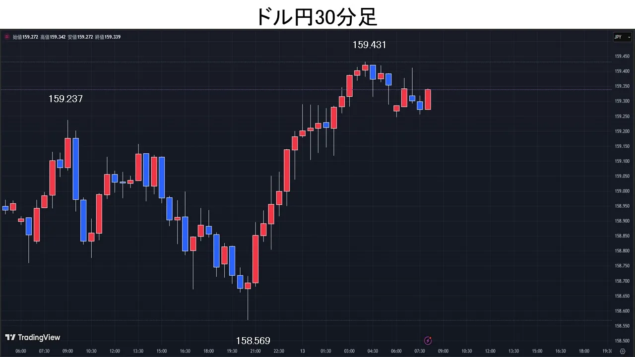 東京時間、ドル円は、時間外の原油先物価格が上昇し159.23円まで上昇。東京仲値にかけて失速し、時間外の米10年債利回りが低下したことを受け158.79円まで下落。その後は159円を挟む小動き。欧州時間、時間外の原油先物価格が90ドルを割り込むと、ドル円は158.56円まで下落。NY時間、イランの国営テレビが、殺害されたハメネイ師の後継者でイランの新しい最高指導者に選出されたモジタバ師の初の声明を公開。この中でモジタバ師は「ホルムズ海峡は引き続き閉鎖されるべきだ」「戦争が持続すれば、他の戦線が開かれる」と述べたうえで、米国への徹底抗戦の構えを強調した。中東情勢の緊迫化に伴う供給懸念から、原油先物価格が97ドル台まで上昇すると、NYダウ平均が急落。ドル円は「有事のドル買い」が先行し、159.43円まで上昇し、1/14の年初来高値159.45円に迫った。