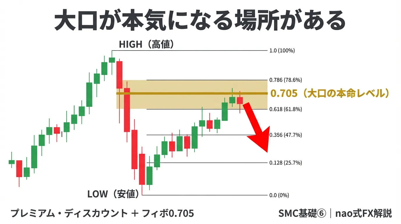 ICTの考え方では、機関投資家(大口)が最も本気でポジションを積んでくるのは0.705とされています。0.618では「まだ浅いかも」と様子を見る大口も、0.705に来たとき初めて「ここだ」と確信を持って注文を入れてくる——そういうレベルです。