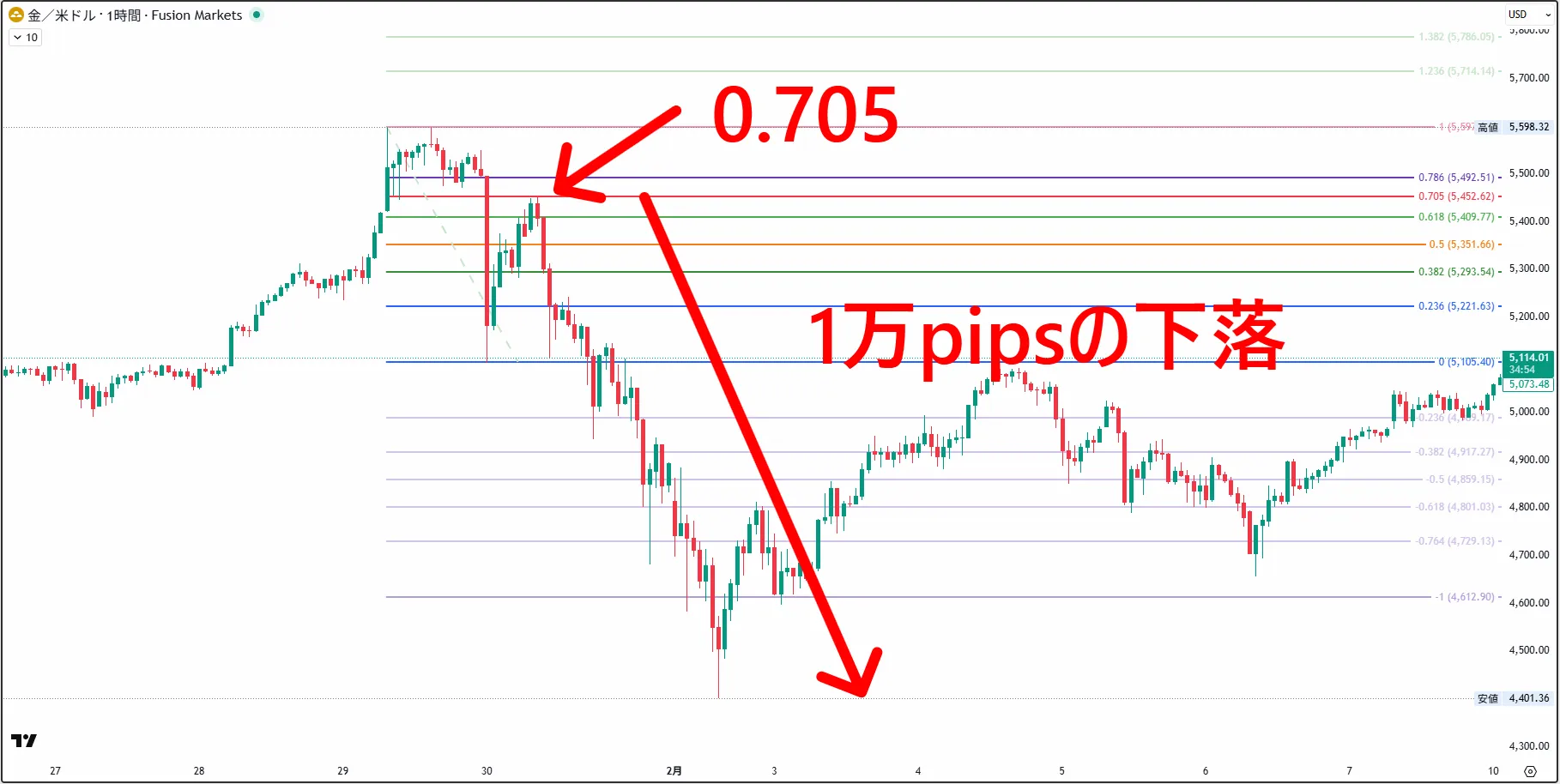 1/29の最高値からまず約4,900PIPS急落(→5,106.41付近)。その後、価格は反発し——0.705(5,449.52)のラインにピタリと頭を叩かれ、そこから最終安値4,401.36まで約10,485PIPSの壮絶な下落が始まりました。すべて1/29〜2/2の期間に起きた動きです。