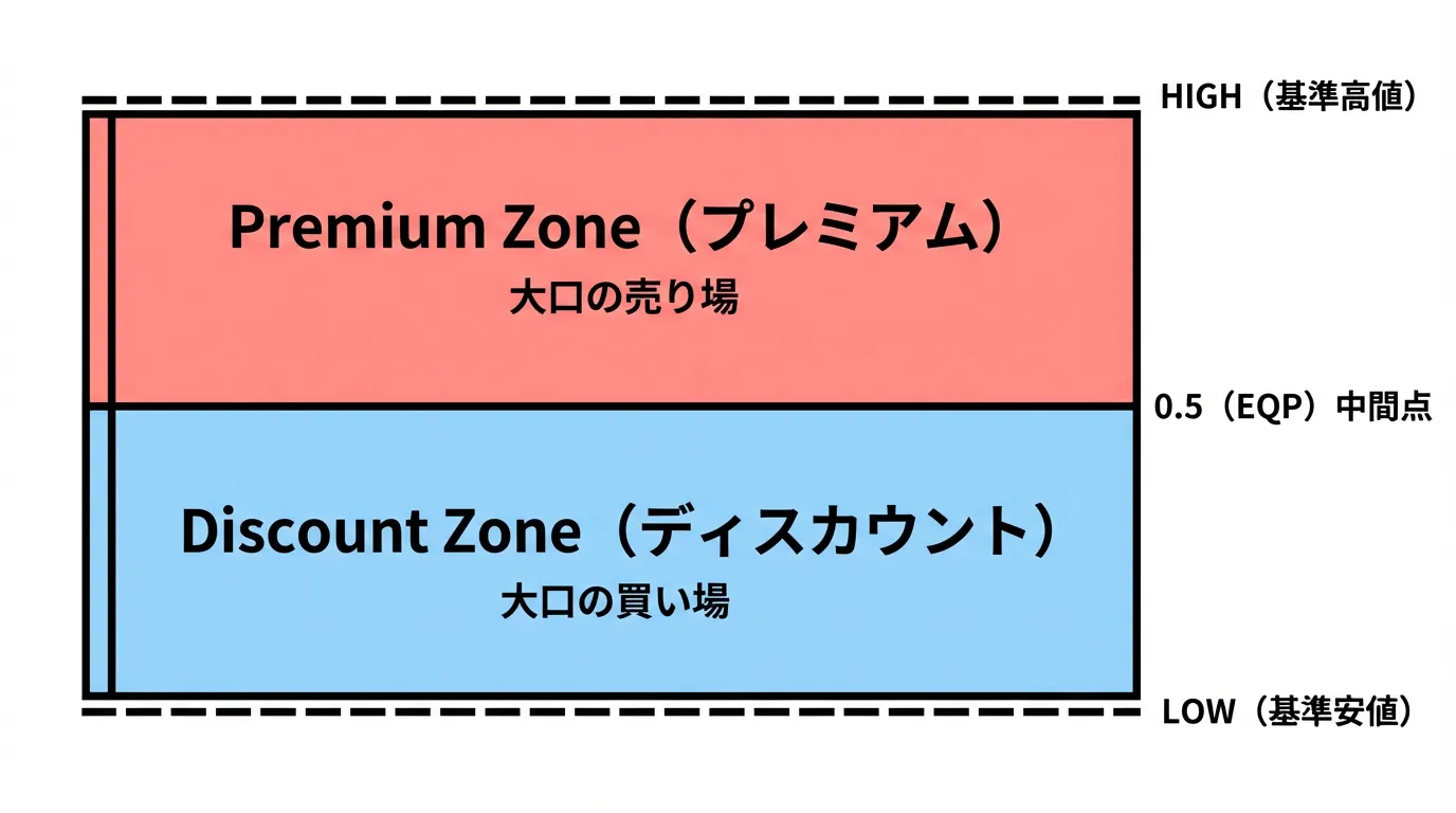 直近の高値と安値の中間点(0.5ライン=EQP)を引き、その上が「プレミアムゾーン(高値圏)」、その下が「ディスカウントゾーン(安値圏)」になります。
