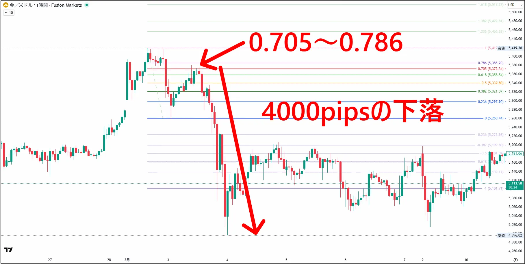 この急落後の戻りを計測すると、3/1の戻り高値(5,419.36)から基準安値(5,260.82)へのフィボで、戻りが0.705(5,372.73)〜0.786(5,385.59)のゾーン内にピタリと収まり、そこからさらに大幅な続落(→4,996付近)が起きています。