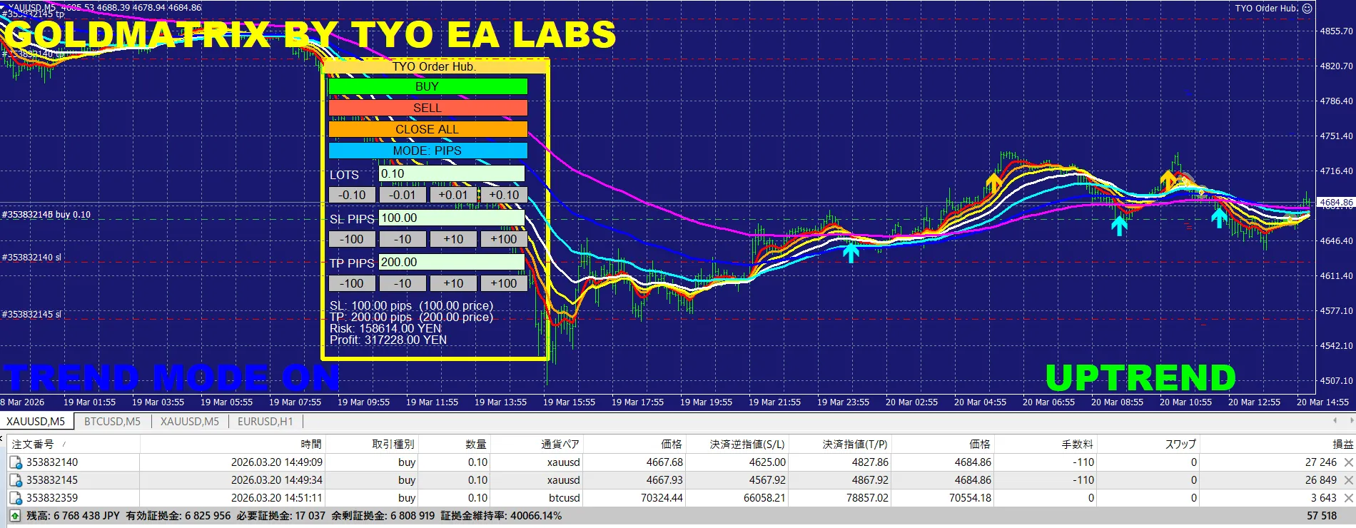 本日のGOLDMATRIXは、朝の立ち上がりから非常に安定したアップトレンド環境を捉えており、全体として順調な稼働を維持しています。