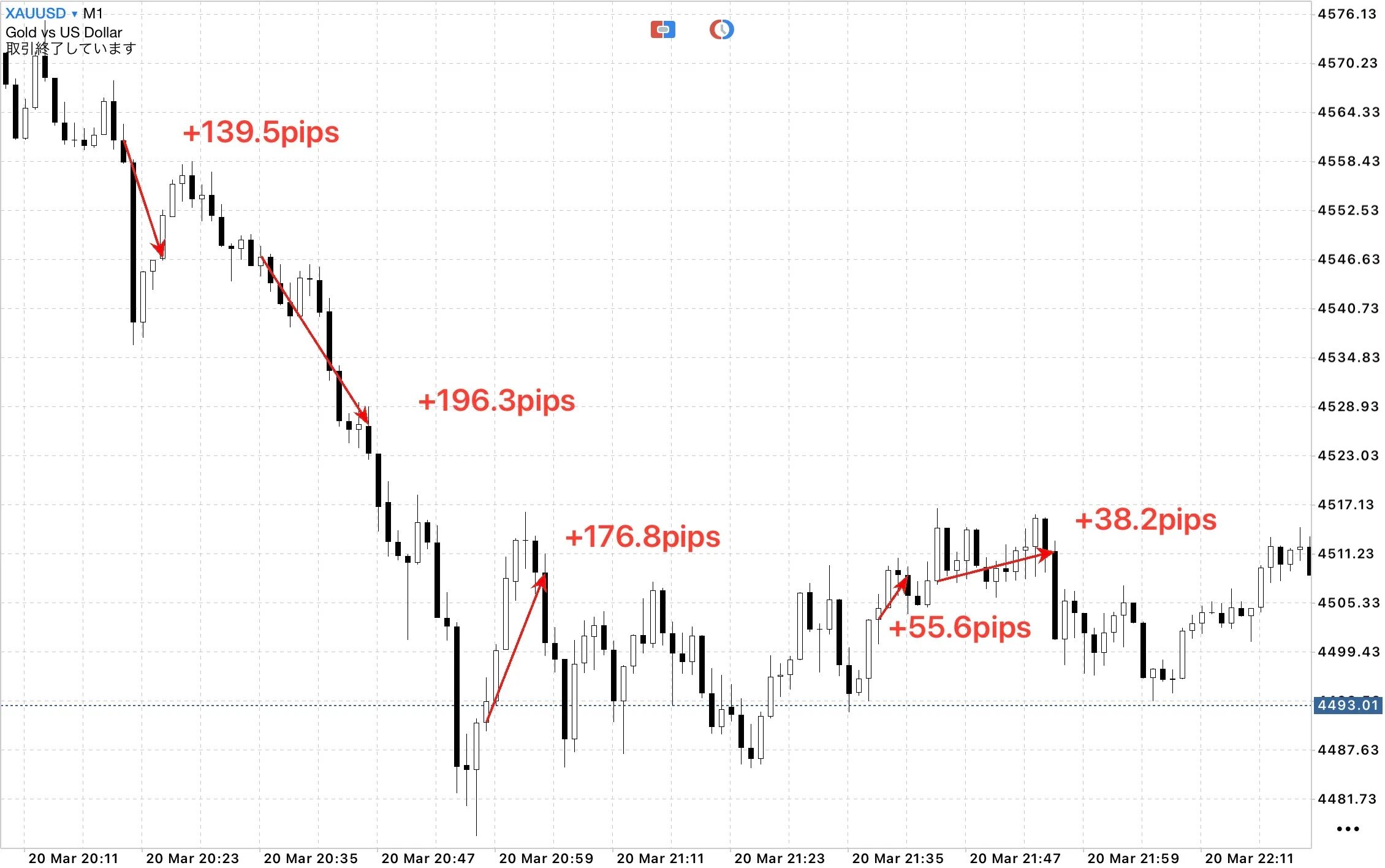 こちらは、なんと1本のローソク足だけで決済しています。