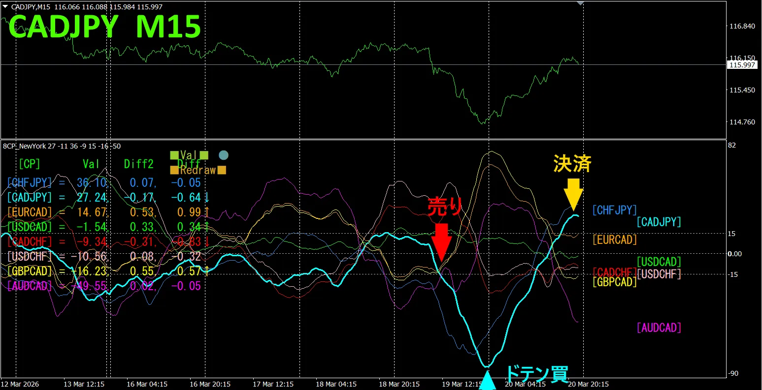 上半分は、CADJPYの15分足チャートです。下半分は、「8CP見える化インジケータ」によるものです、水色のグラフがCADJPYに相当します