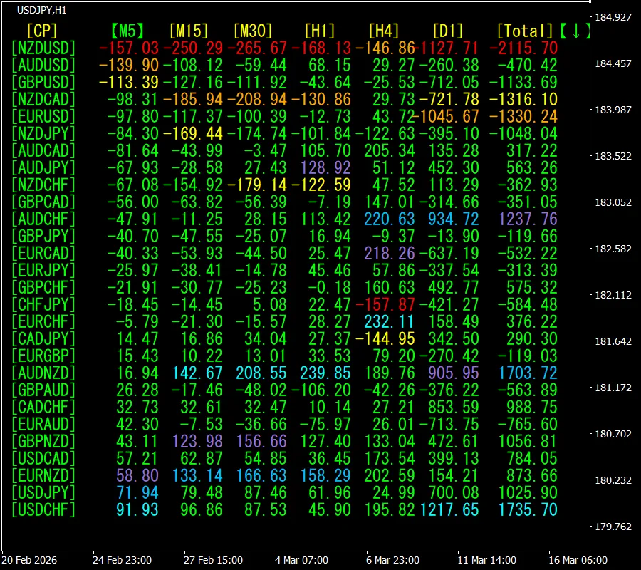 [M5]で数値の昇順に並んでいます。一番上にあるNZDUSDは、全ての時間足で赤色系の表示色になっています。Total数値が、-2115.70で、マイナスの数字になっています。NZDUSDに下降トレンドが発生していることが示唆されます。
