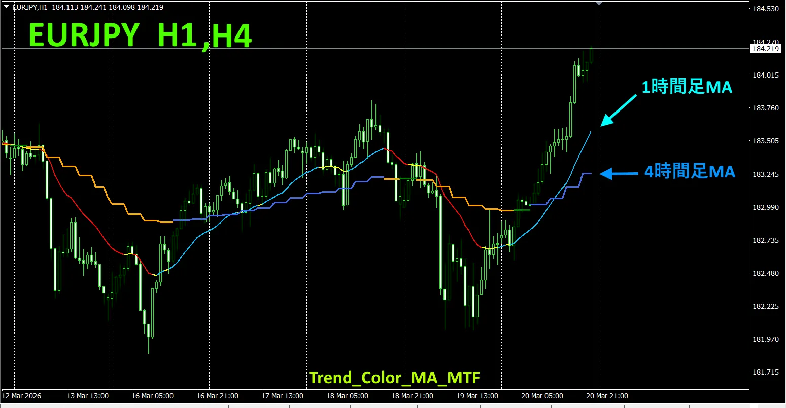 一例として、EURJPYの1時間足チャートに、4時間足の移動平均線を同時に表示させてみました。ガタガタと階段状になっているのが、4時間足の移動平均線です。1時間足の移動平均線も、4時間足の移動平均線も、上昇時は青色系のカラーで、下降時は赤色系のカラーで表示されるので、カレントチャートのトレンド方向と、上位足のトレンド方向が、カラーで一目で判別できます。