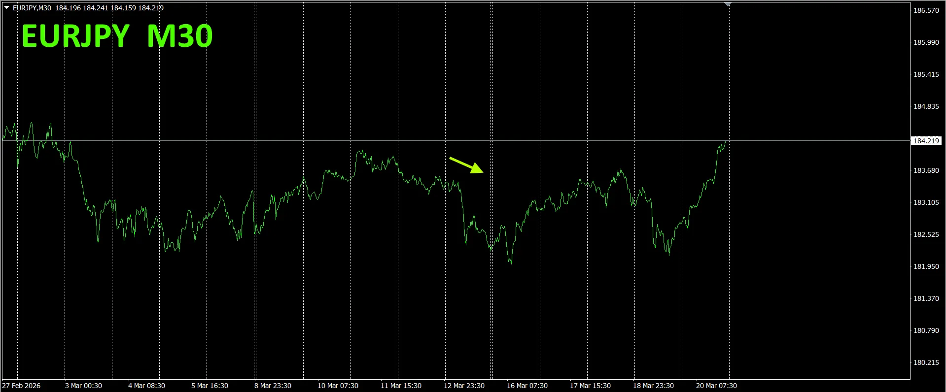全体の流れを見るため、30分足チャートで直近約3週間分を描いています。