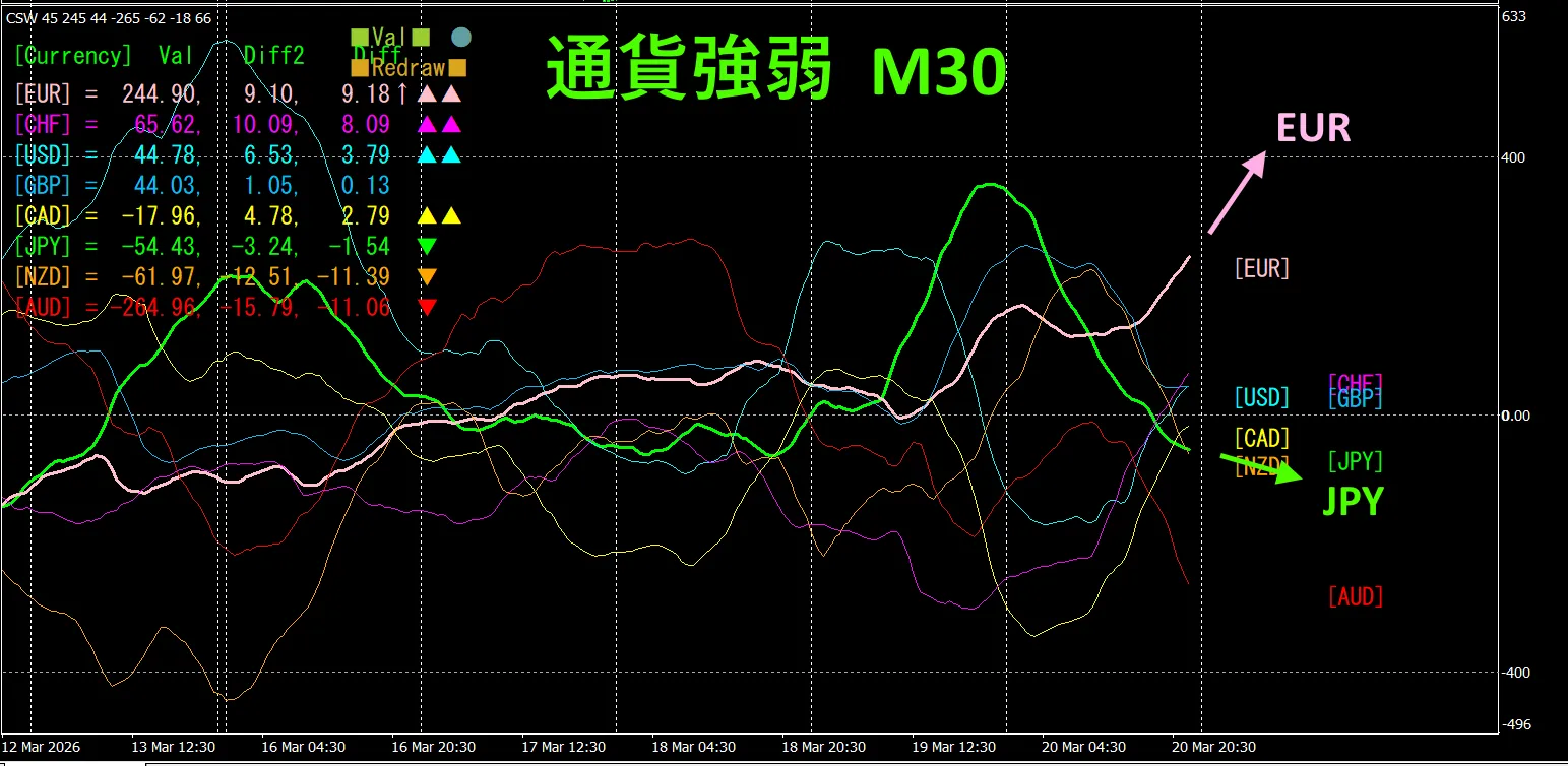 ピンク色がEUR、緑色がJPYです。EURは、やや下向き、JPYは上向きになっているので、今後のEURJPYは、下落方向に向かうと考えられます。