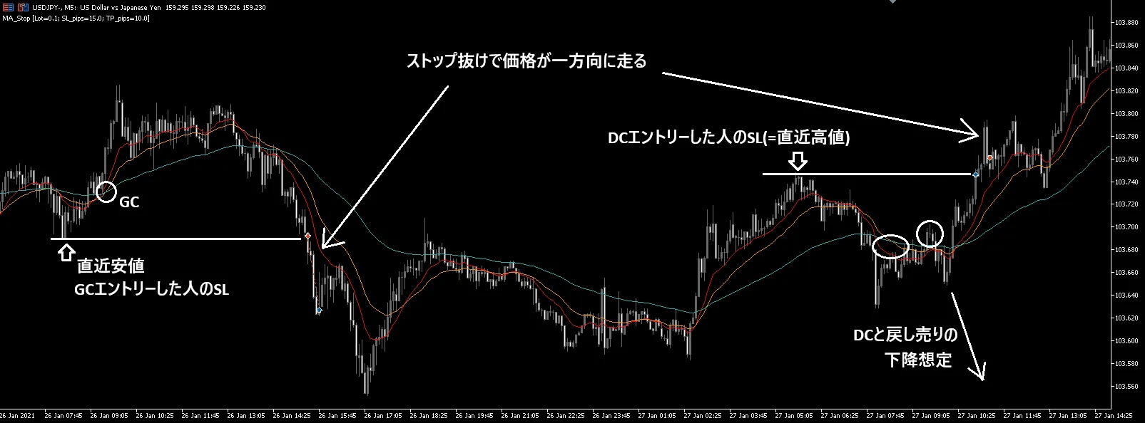 jさんが「MAはエントリーのタイミングを測るためには使わないけど、大衆の動きを読むために表示している」というニュアンスの発言をしたのはこういう使い方をしているからです。